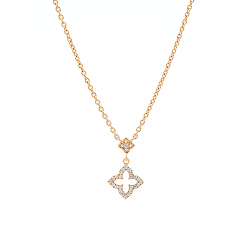 With a luminous mother of pearl pendant reminiscent of moonlit petals adorning a blooming garden, this piece is a work of art. A stunning extension of the iconic casablanca series.