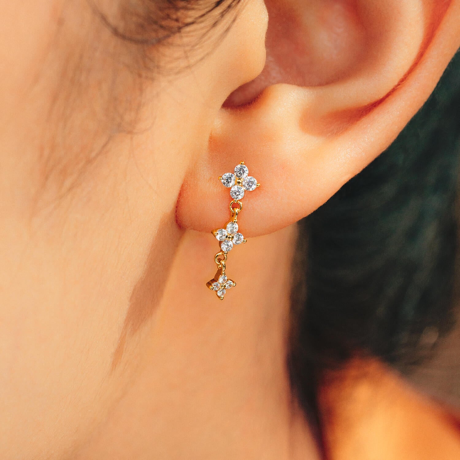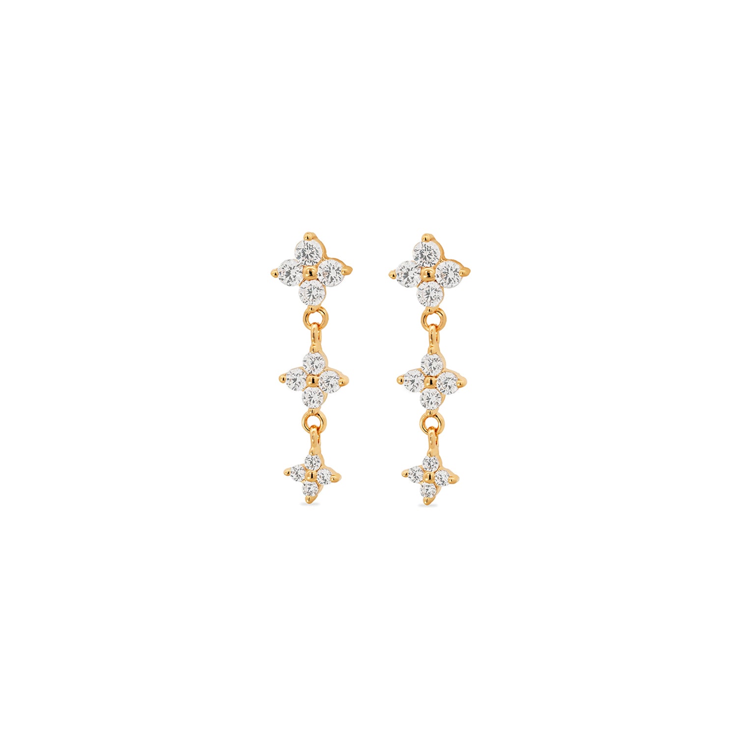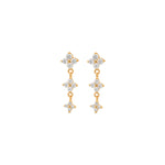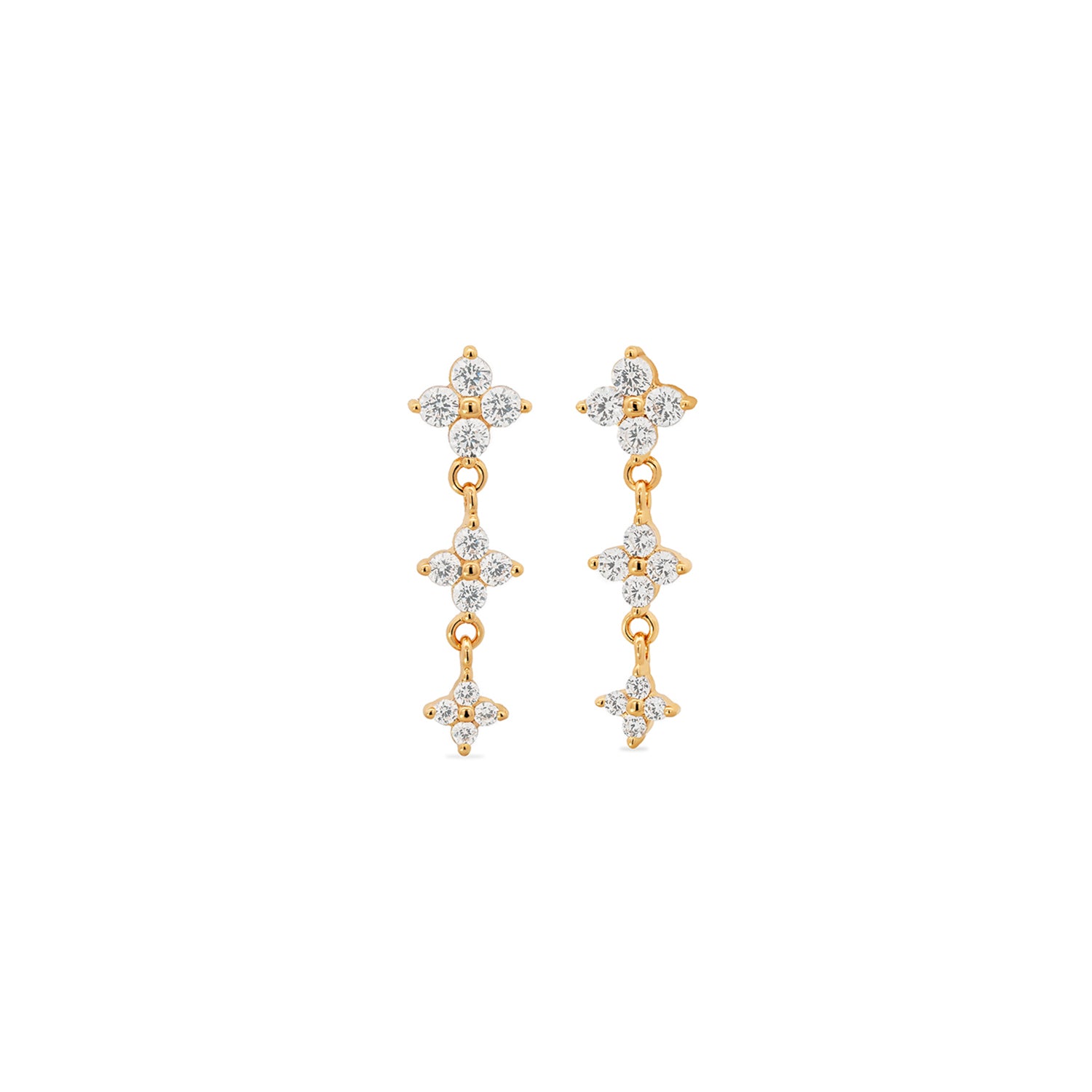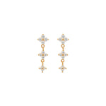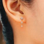 Inspired by stars and the sparkling night sky, Soraya is a pair of brilliantly bright dangle ear studs designed to sway and swing with movement.