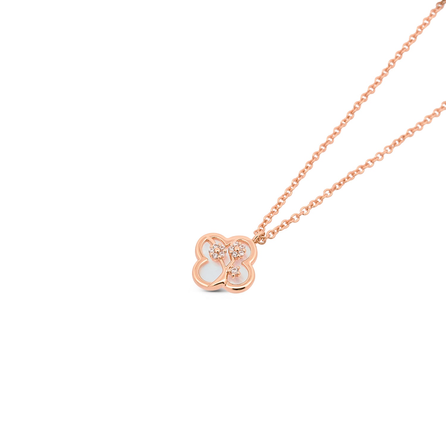 Materials: 18k rose gold-plated eco-brass, e-coating, white mother of pearl, cubic zirconia stones