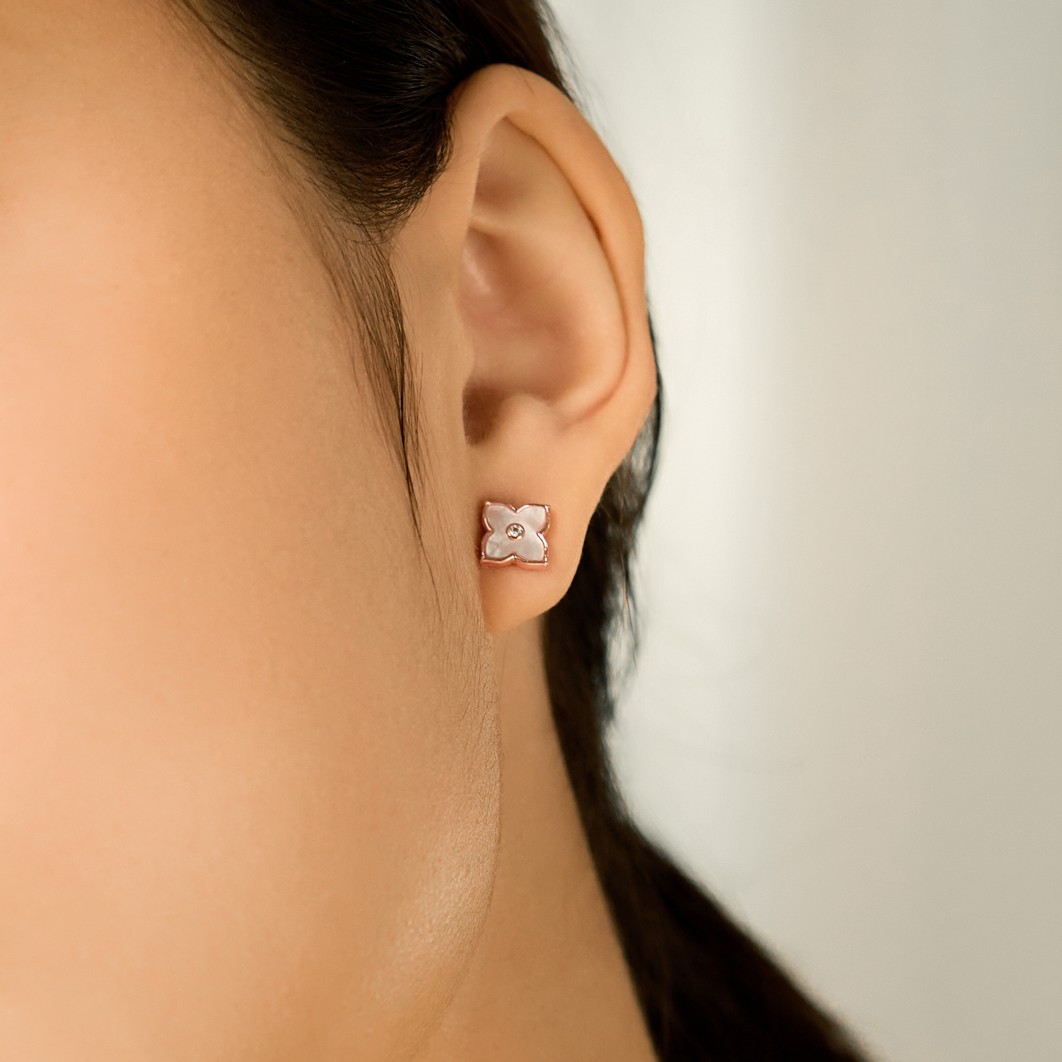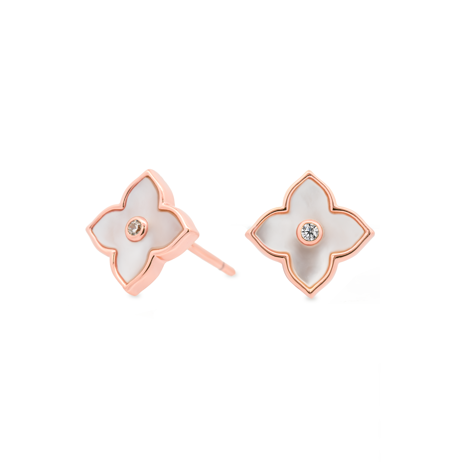 Materials: 18k rose gold-plated eco-brass, e-coating, white mother of pearl, cubic zirconia stones