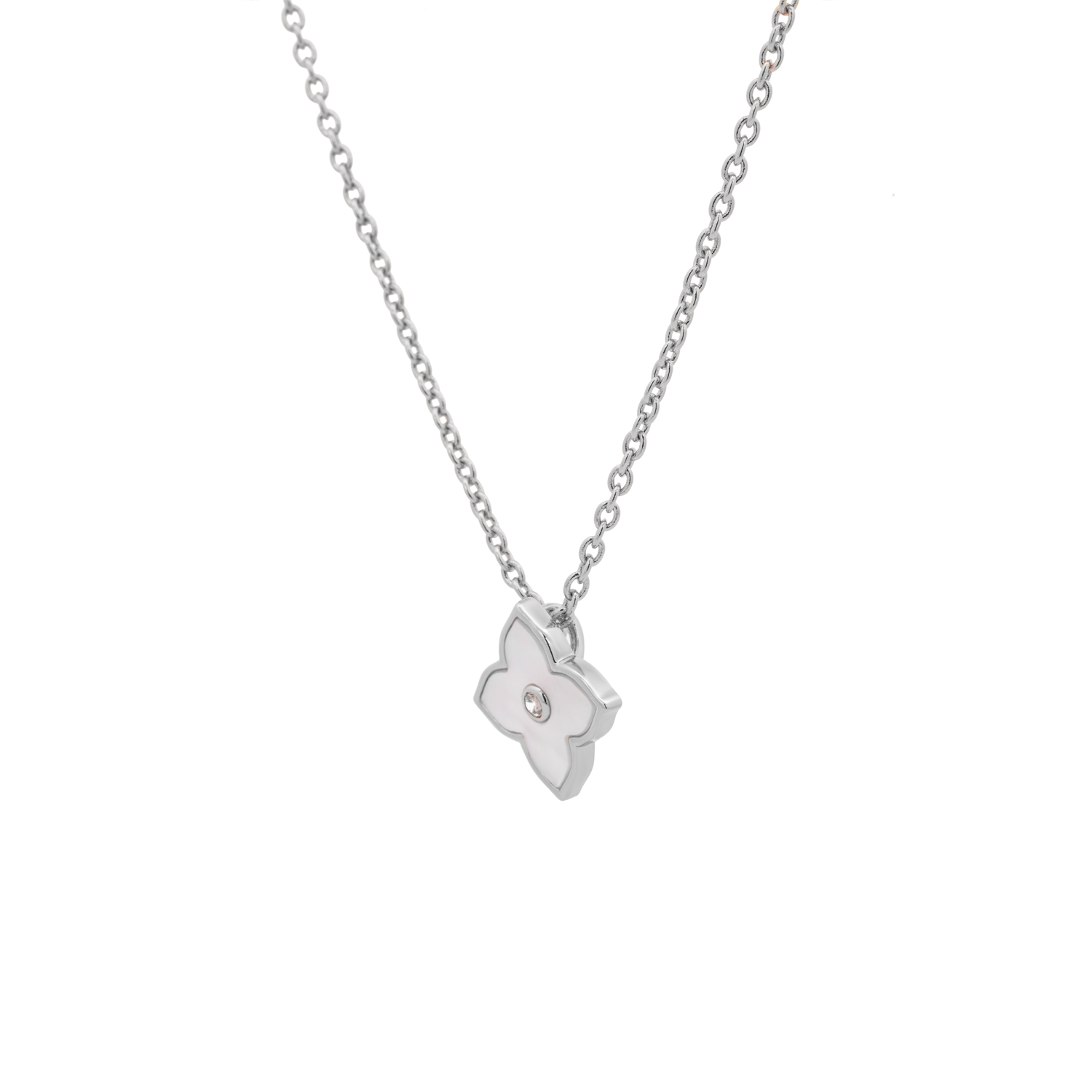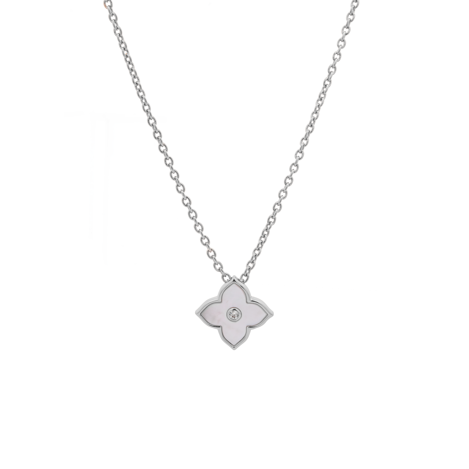 With a luminous mother of pearl pendant reminiscent of moonlit petals adorning a blooming garden, this piece is a work of art. A stunning extension of the iconic casablanca series.