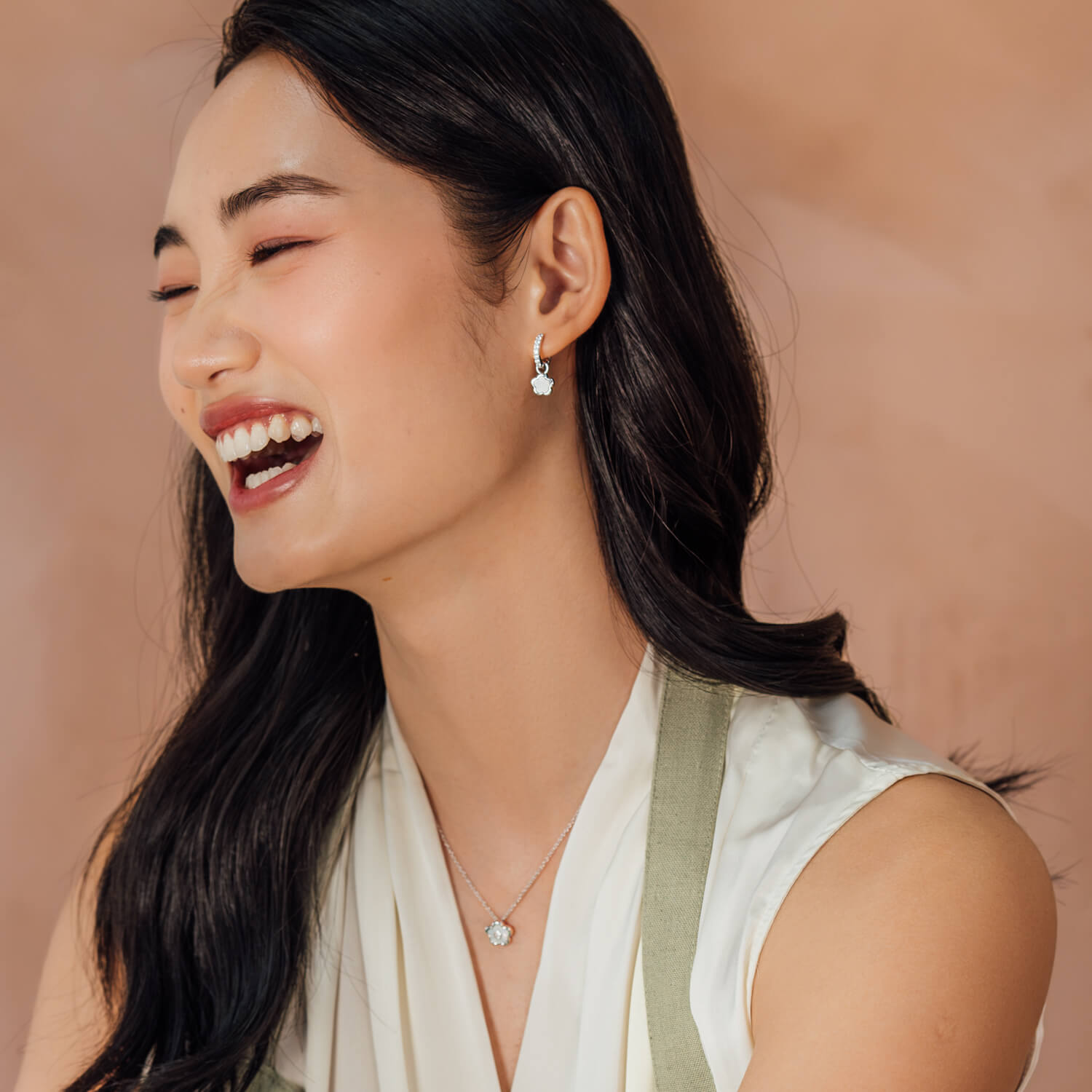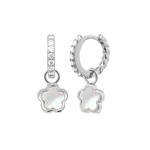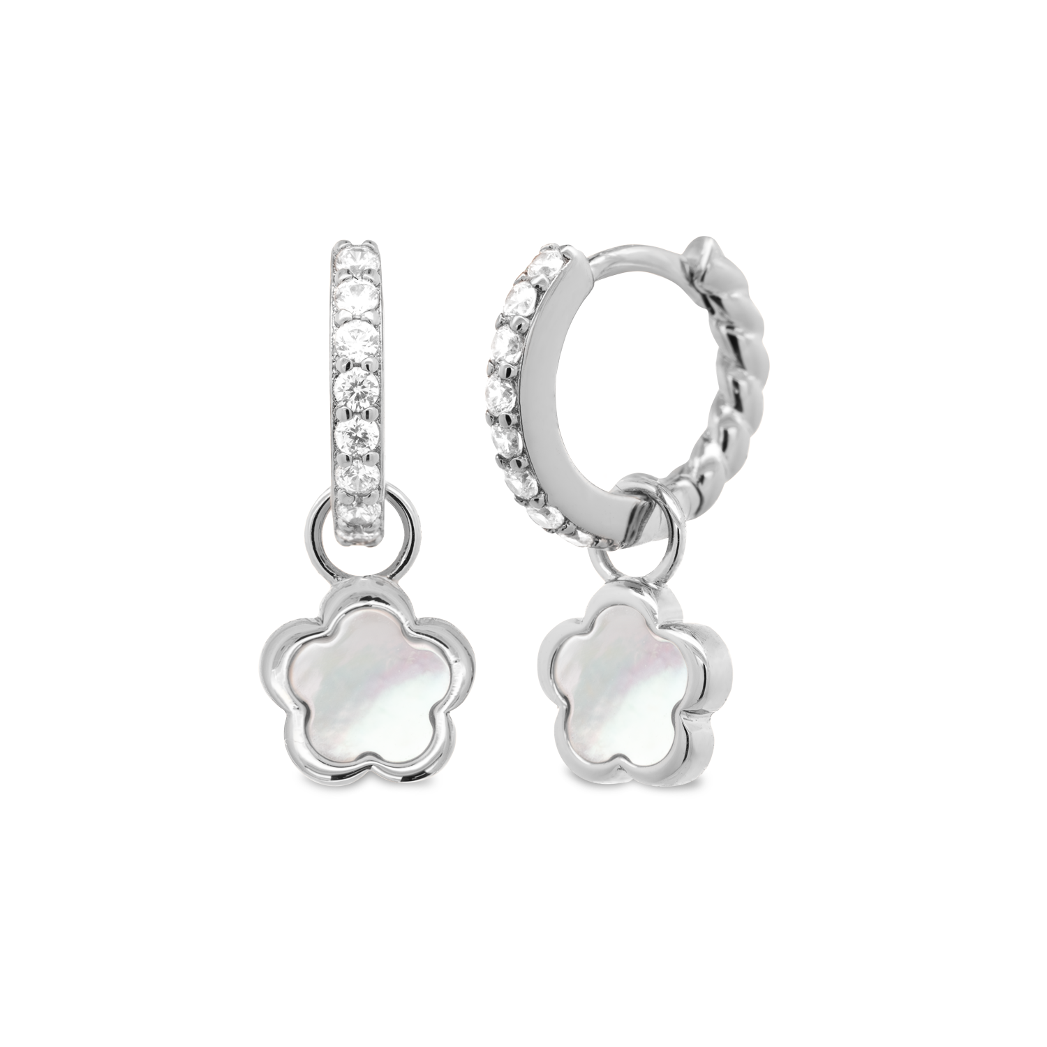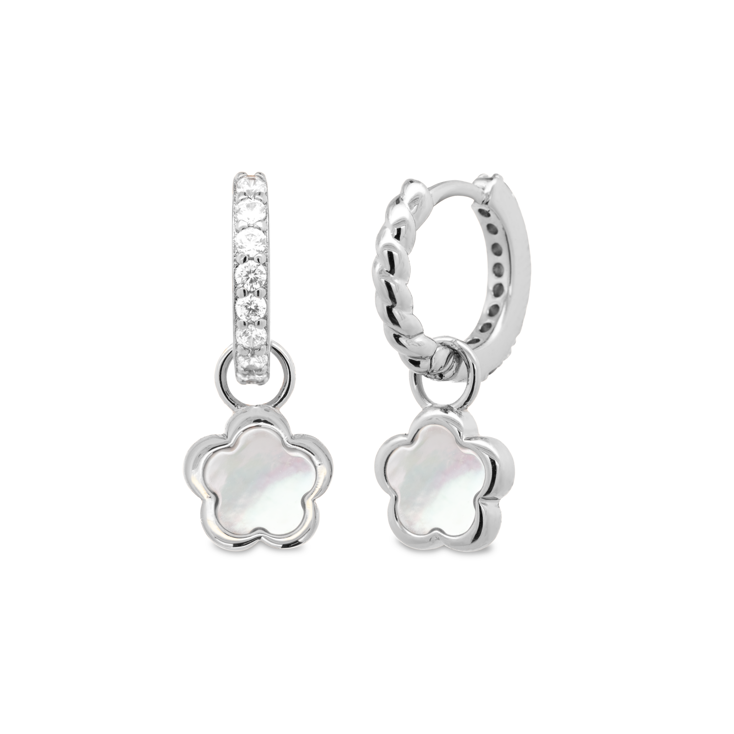 Mother of pearl drop charms add a playful and elegant touch to the quintessential flower motif on the Cressida huggies. Its lustrous sheen stands out in a garden of blossoms. Wear it multiple ways with its embellished front and braided back, with or without the removable charms.