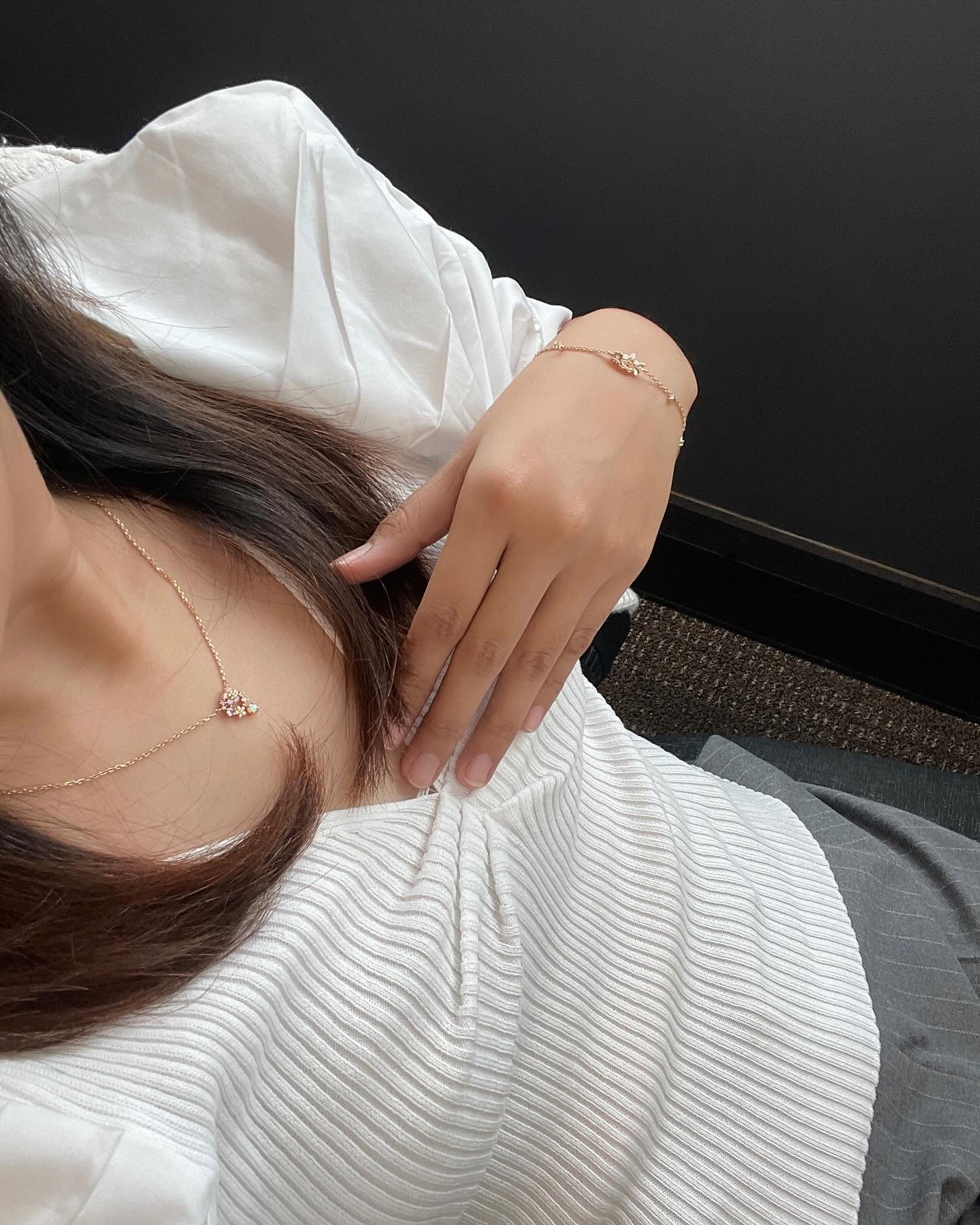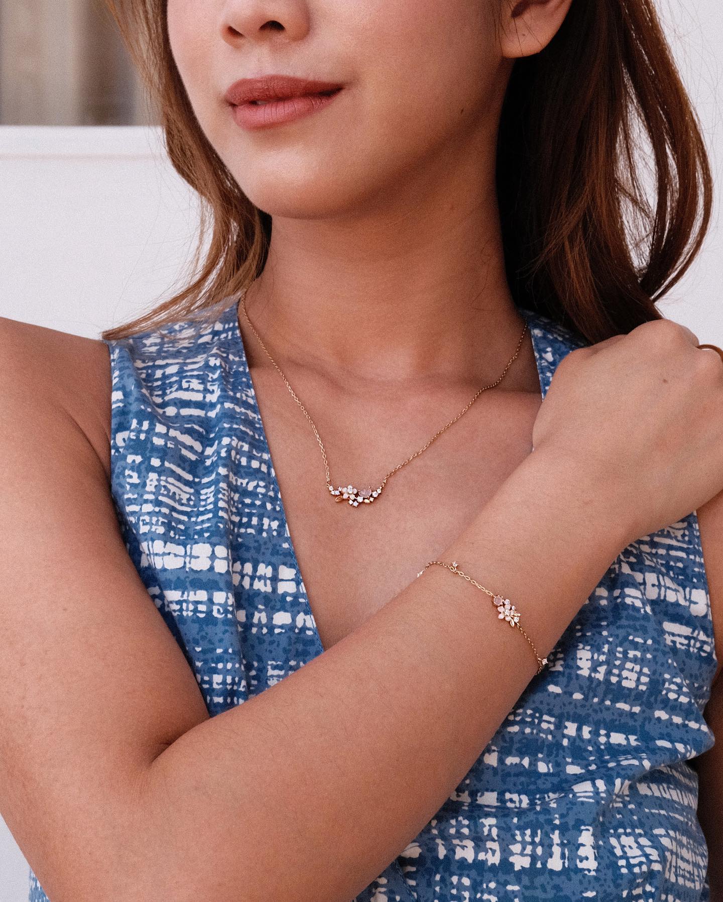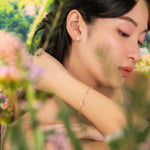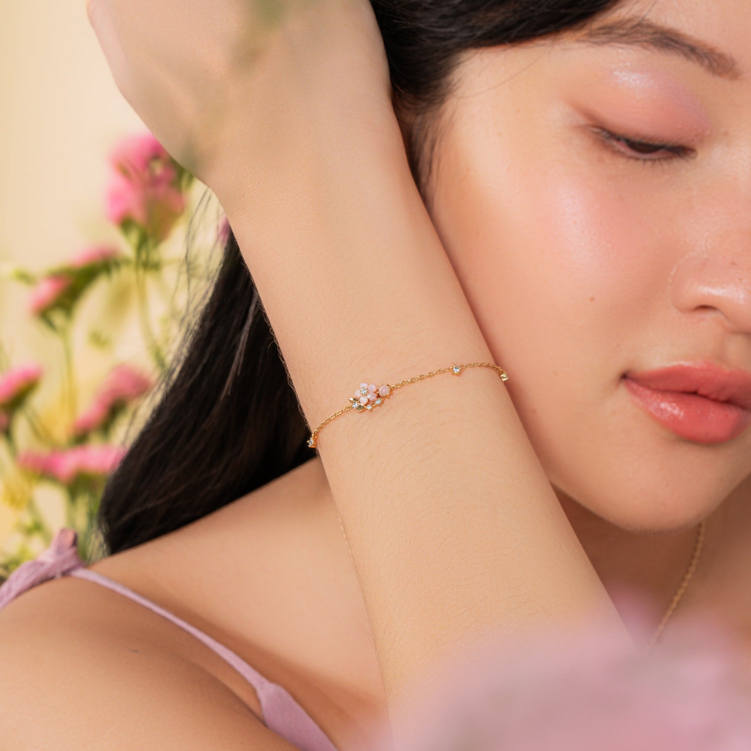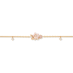 Complete with a pink mother of pearl blossom, pink glass and charming cubic zirconia stone charms, Anne is a blossoming garden in the form of a bracelet.