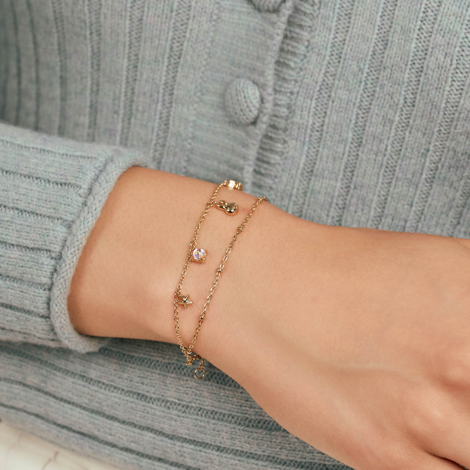 Adorned with a main miffy pendant, a series of star-shaped charms, and iridescent synthetic moonstone the miffy Starlight Bracelet is as dainty as it is dreamy. Match it with its complementary necklace counterpart.