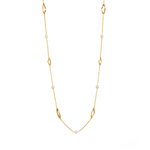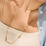 Perfect on its own or as a layering piece, Laguna is a long necklace adorned with a series of freshwater pearls and unembellished pendants of soft shapes.