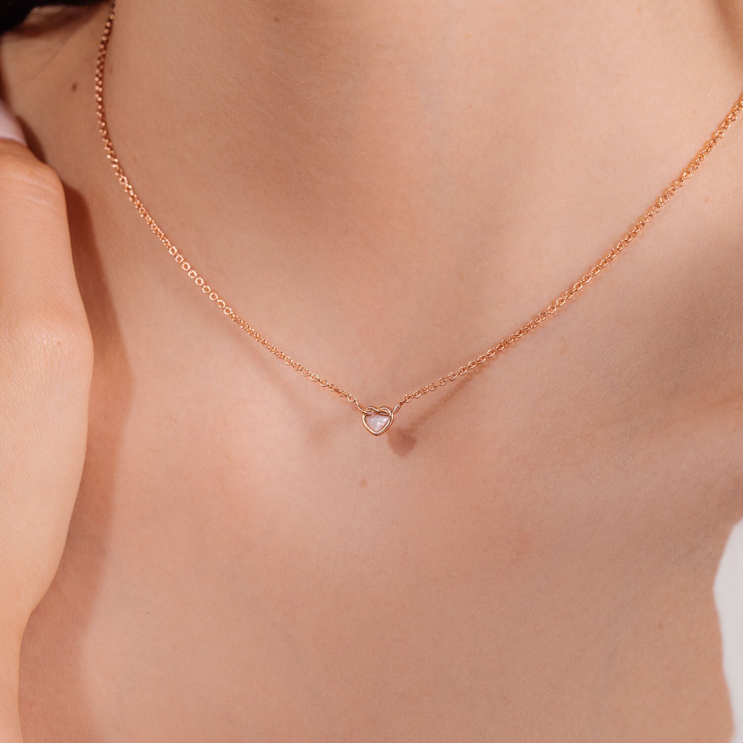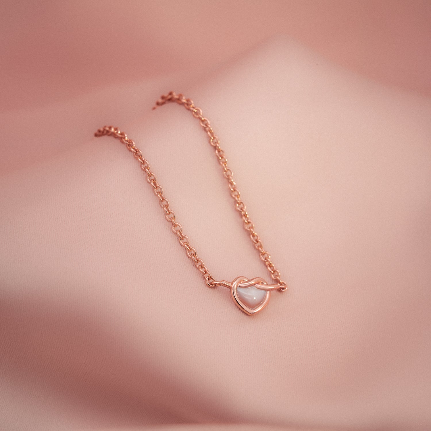 We've put a dainty spin on the classic heart knot! This opalescent number features a shimmering pink mother of pearl pendant.