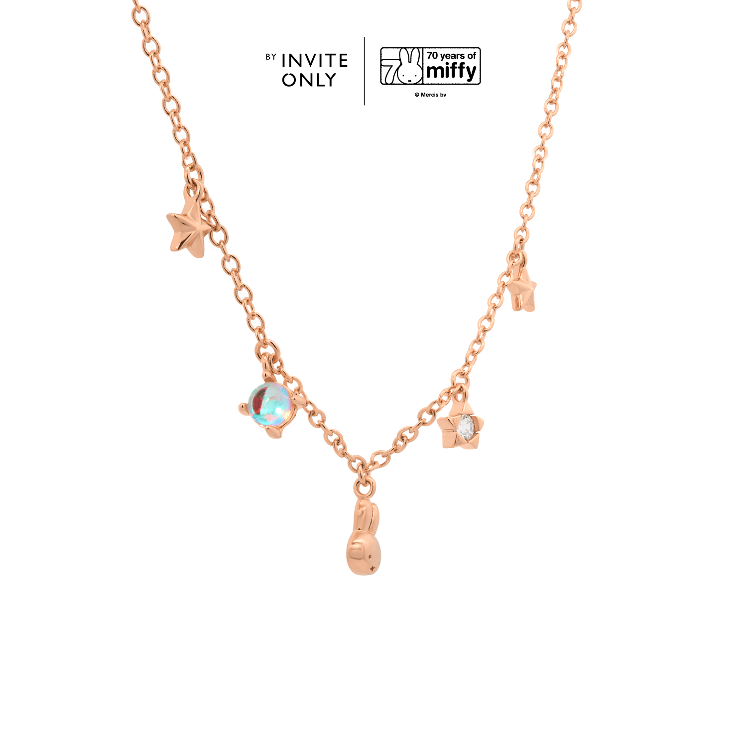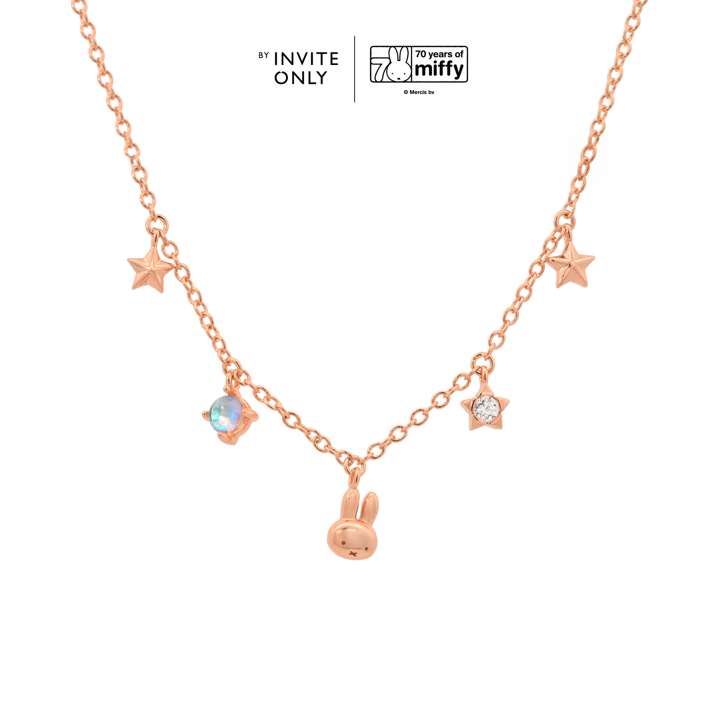 Designed to be as dainty as it is dreamy, the miffy Starlight Necklace is adorned with a main miffy pendant, a series of star-shaped charms, and an iridescent synthetic moonstone accent. Match it with its complementary bracelet counterpart.