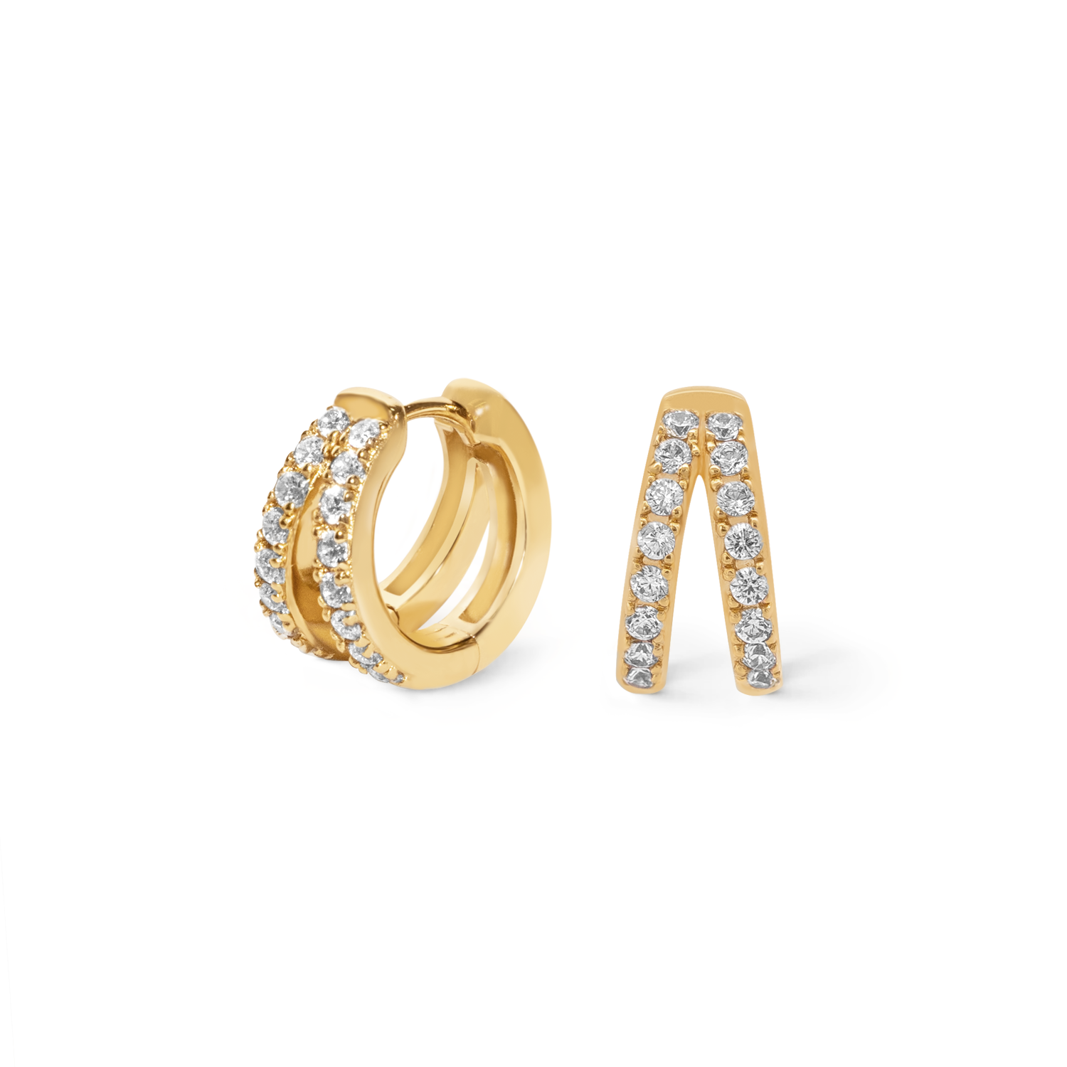 Spice up your look with these double hoop huggies, adorned with cubic zirconia stones in a sleek pavé setting. Experiment with stacking single studs to create your next signature look.