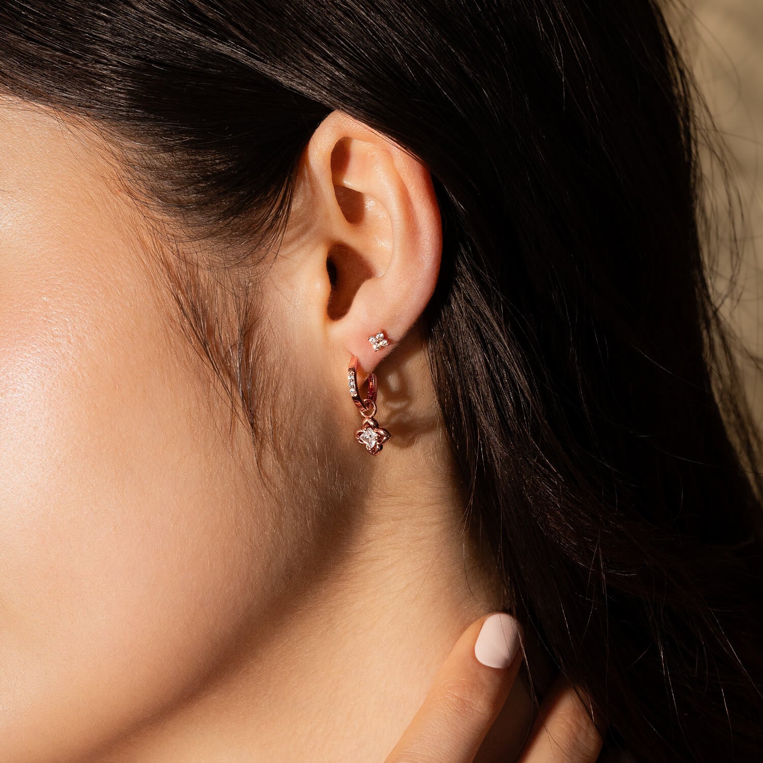 Materials: 18k rose gold-plated eco-brass, e-coating, cubic zirconia stones