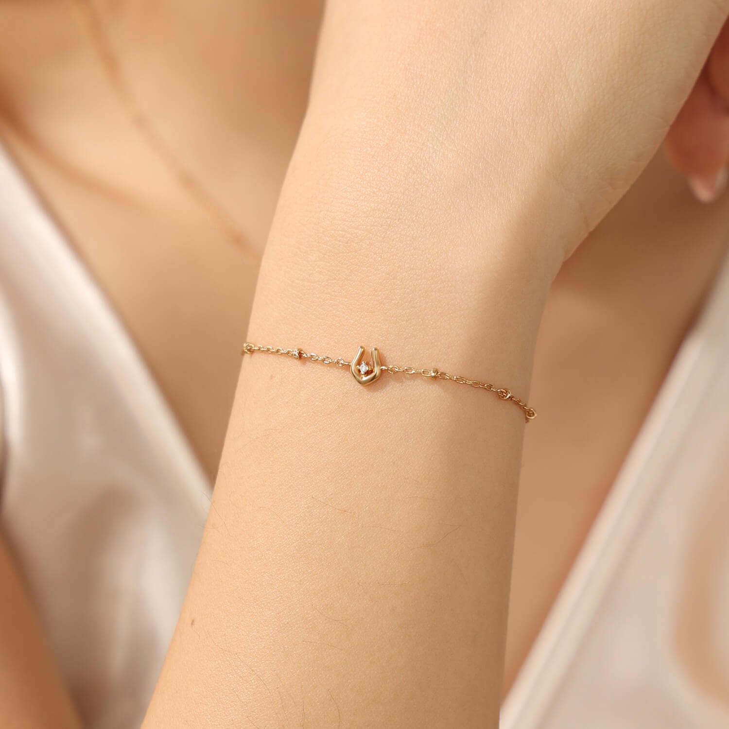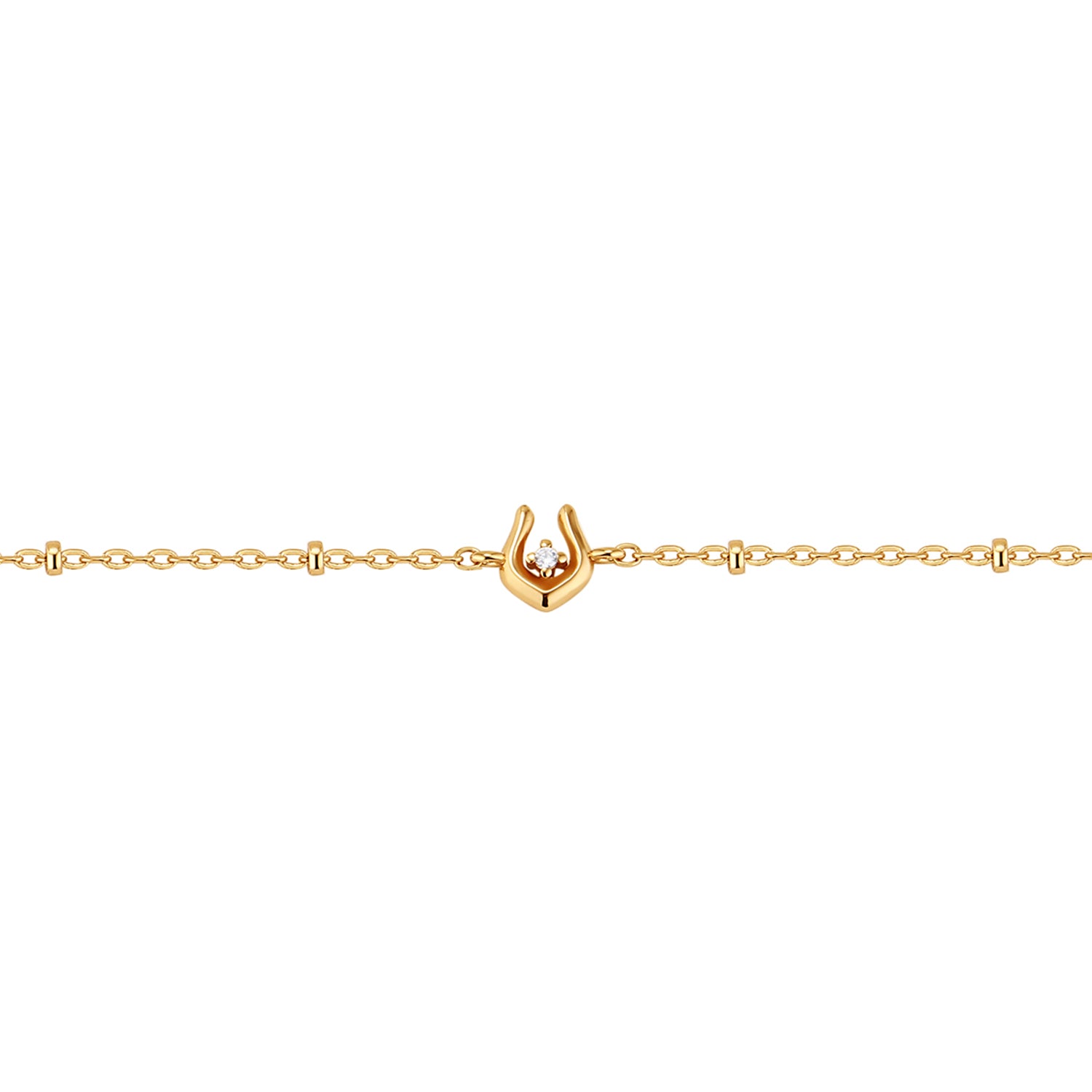 Taking after the shape of an upturned horseshoe, the Caspian Bracelet represents good luck. A single cubic zirconia stone lends a soft, gentle glow to this everyday piece. Complete the look with other Caspian counterparts.