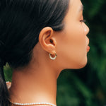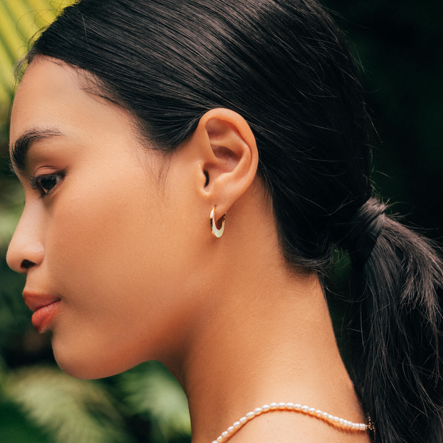 Kai is the classic hoop earring reimagined. Its crescent-shaped body features an opalescent mother of pearl finish that shimmers under light.