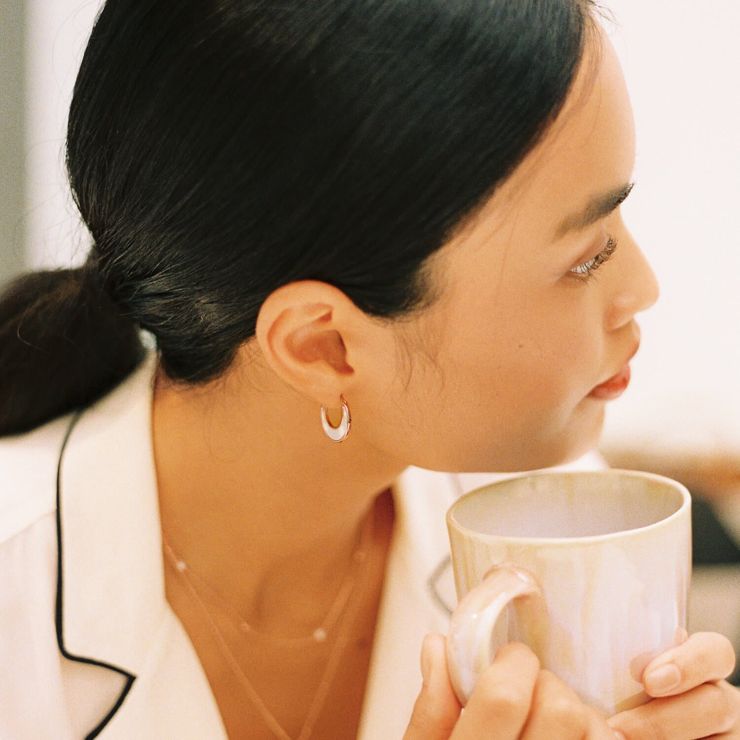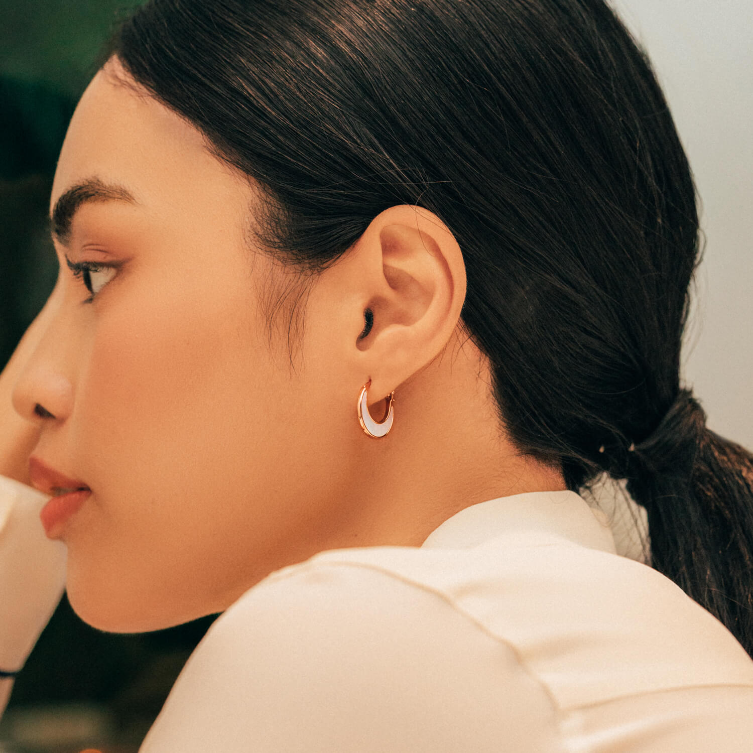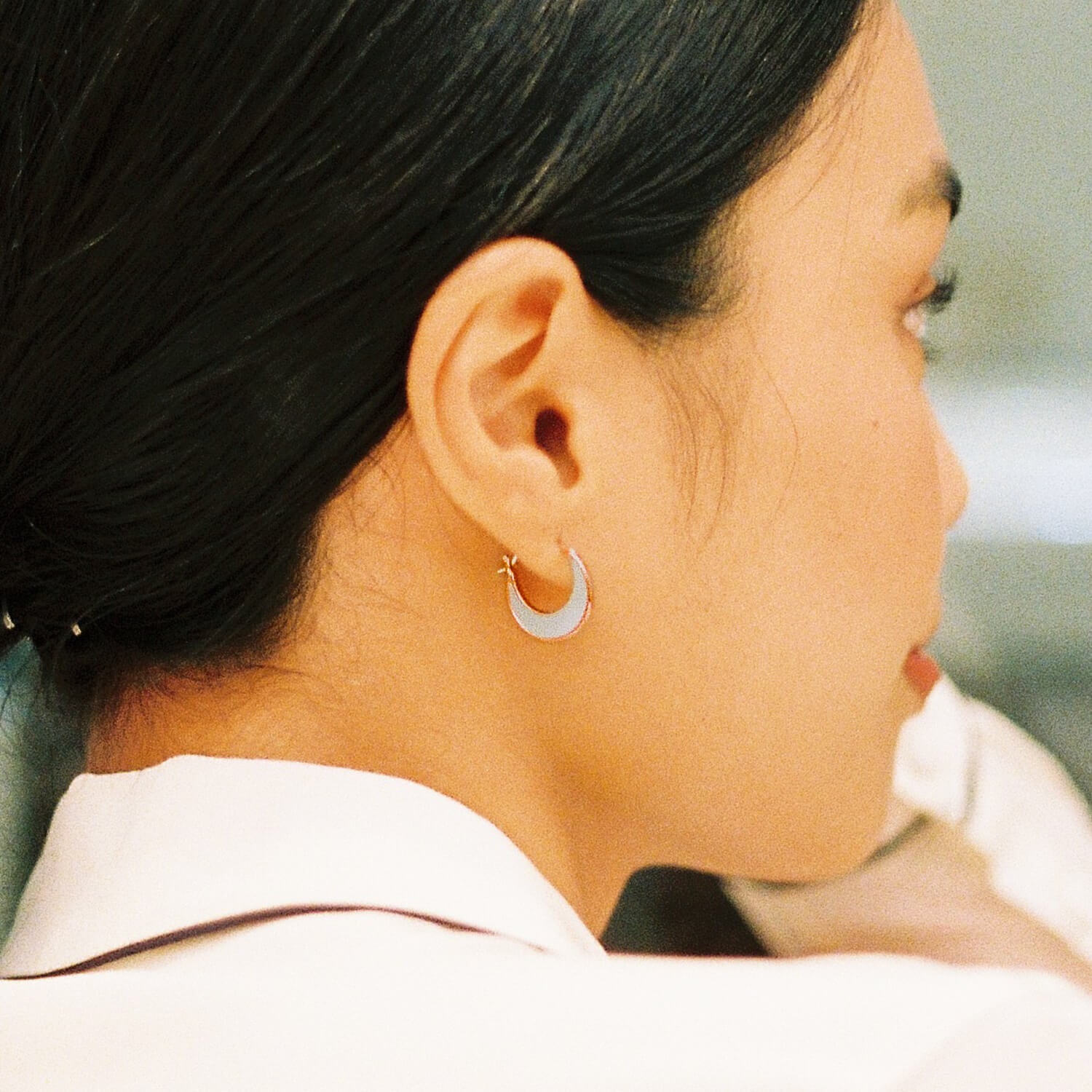 Kai is the classic hoop earring reimagined. Its crescent-shaped body features an opalescent mother of pearl finish that shimmers under light.