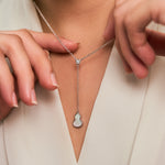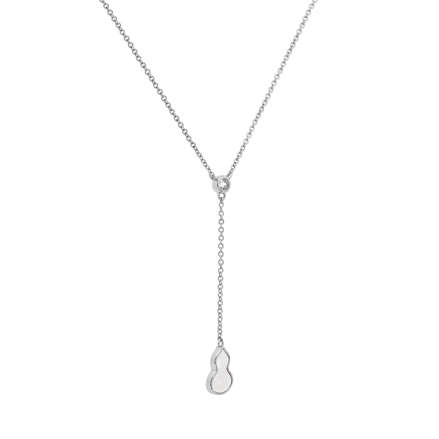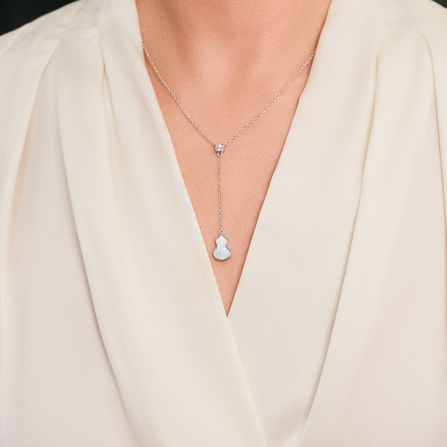 The Blessings Hulu Necklace features a Y-shaped chain embellished with a single cubic zirconia stone, followed by an opalescent mother-of-pearl bottle gourd pendant. An elegant piece to represent blessed and blissful days ahead.