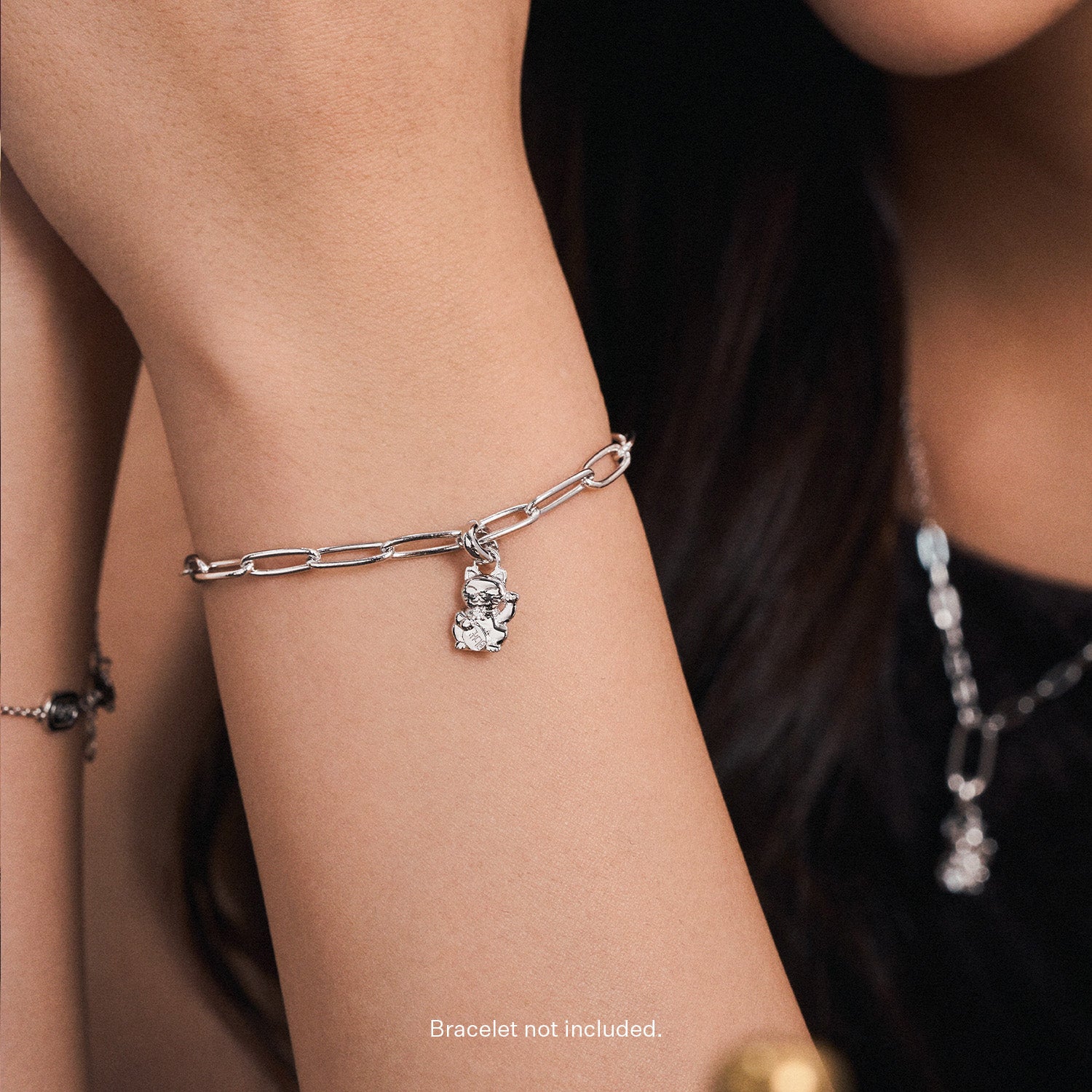 A mini Maneki-neko to bring its wearer bountiful luck. With its cubic zirconia collar and beckoning paws, this smiling fortune cat is a charming addition to your necklace or bracelet.